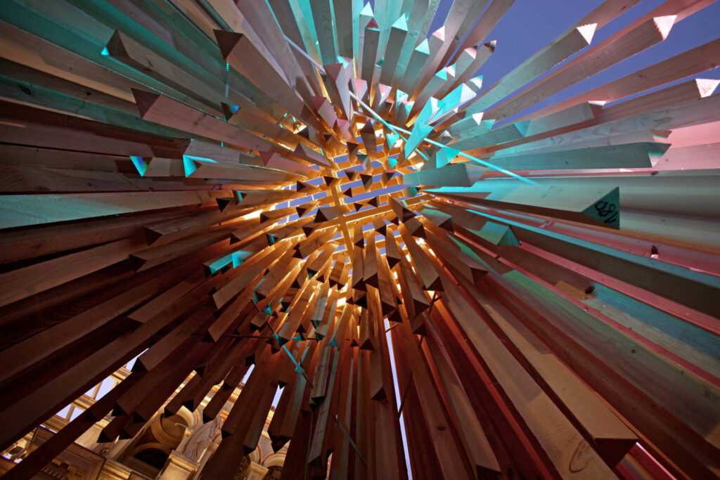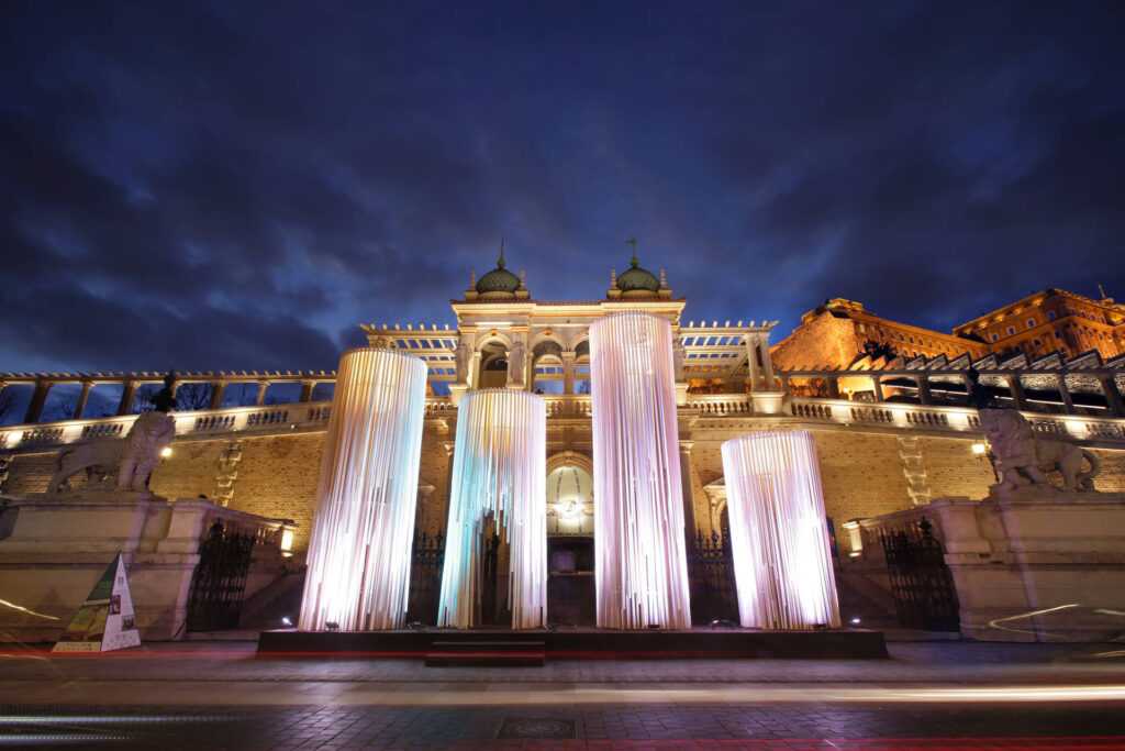 Our Advent Candles were commissioned by the Castle Garden Bazaar in Budapest and were among Europe’s tallest Advent installations in 2015. The suspended wooden laths functioned as wind chimes and were colorfully illuminated to represent the joyousness of the holiday season.