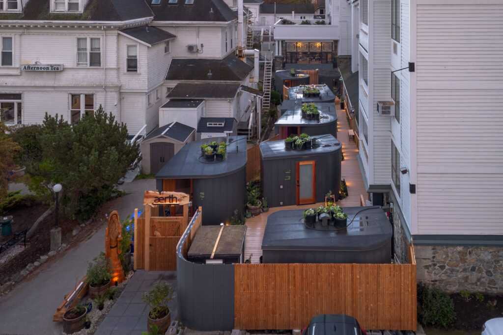 The project reimagines a narrow, underused alleyway and turns it into a serene sauna village. With seven cabins, outdoor baths, and garden spaces, the design transforms a once-forgotten concrete site into a hidden oasis in the heart of Victoria.