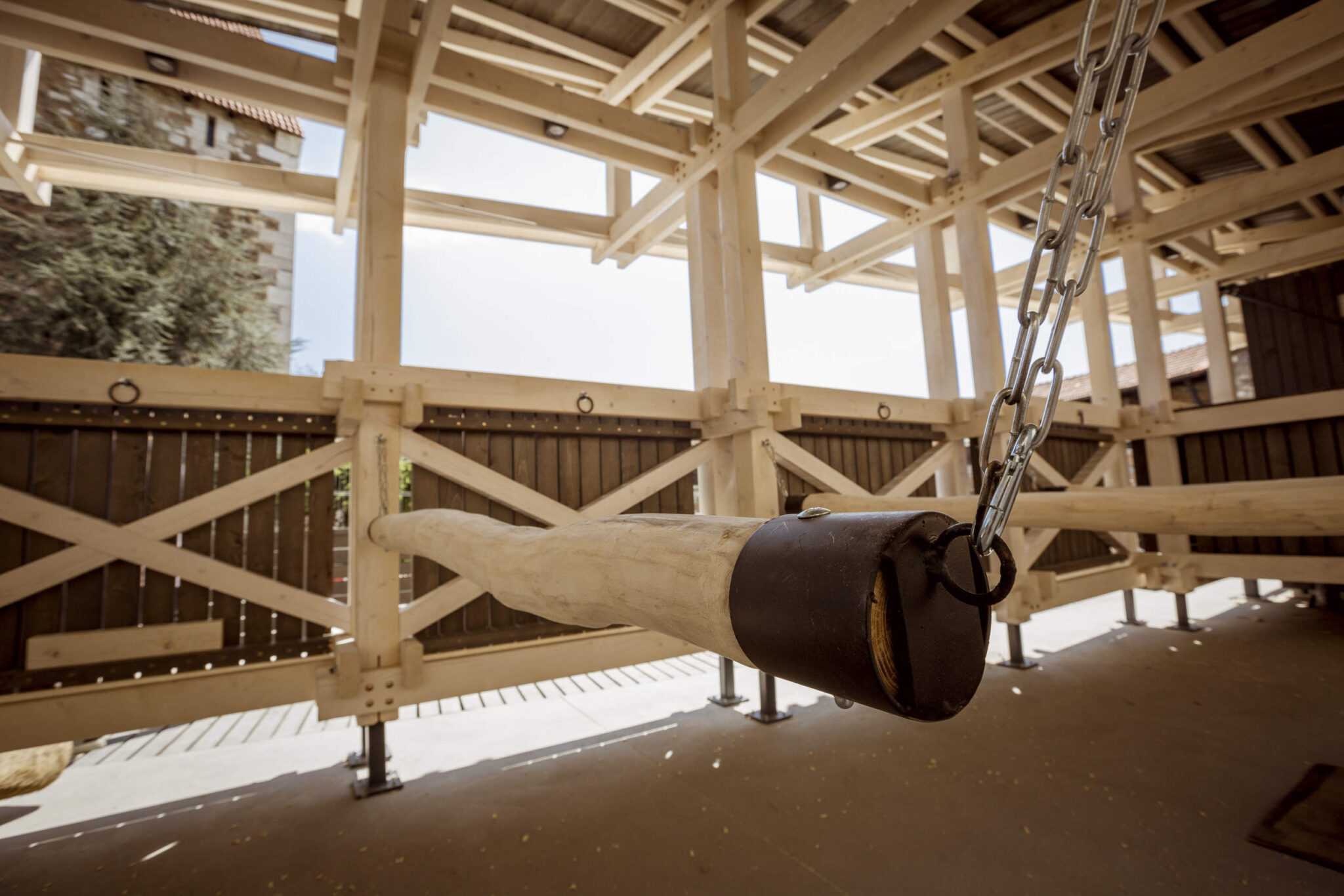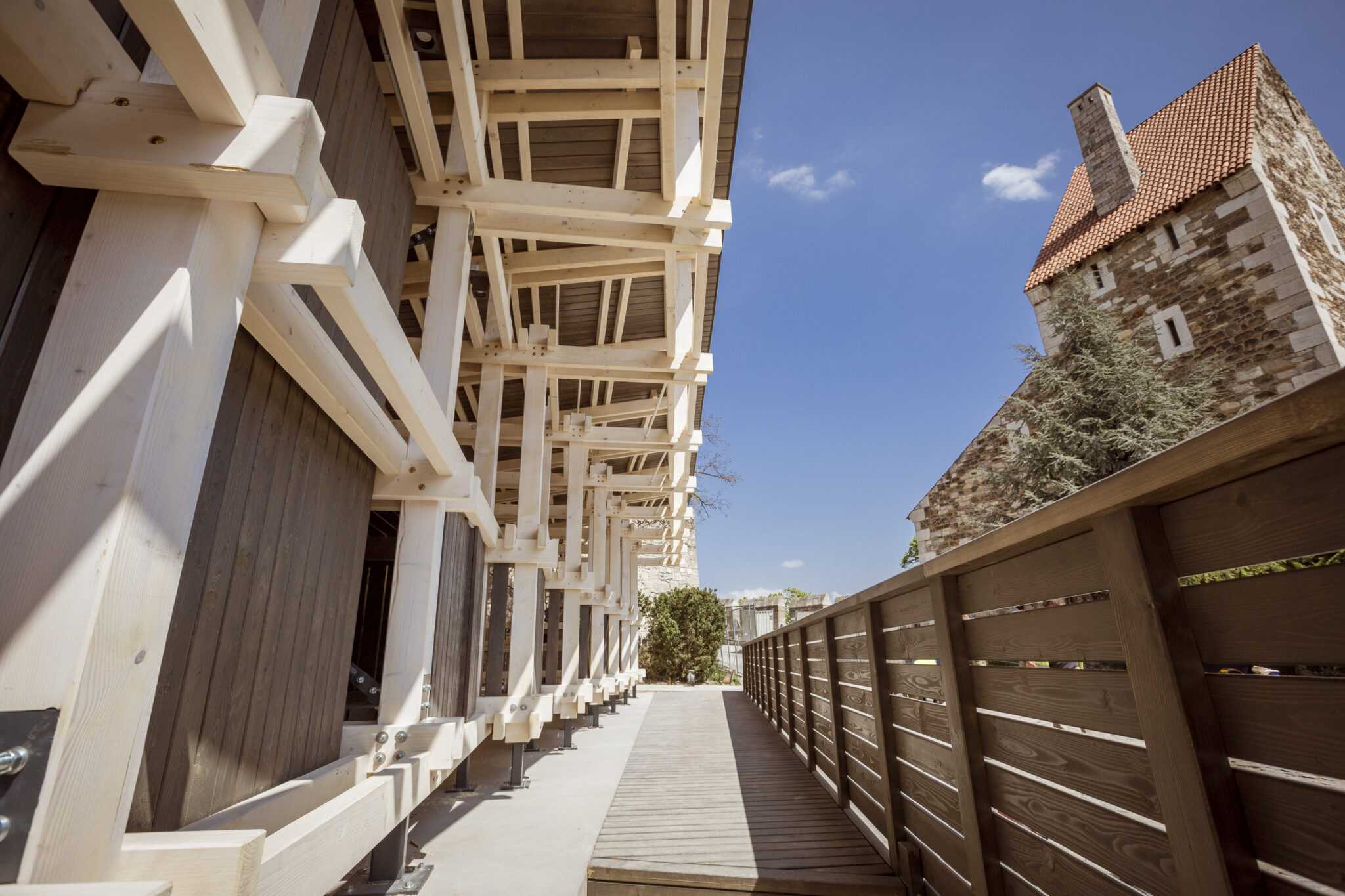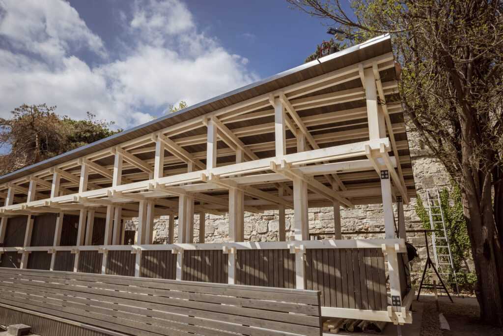 The Stable contains 6 stands for horses and a 13sqm module that serves as a service room for hussars. When we designed the Stable, we placed great emphasis on its relationship with the environment. In order to preserve the feeling of the overall sight, the building fits in as naturally as possible with the environmental conditions of the Southern Rondella – the sloping terrain, the area narrowing in the horizontal projection and the direction of the road to Rondella.