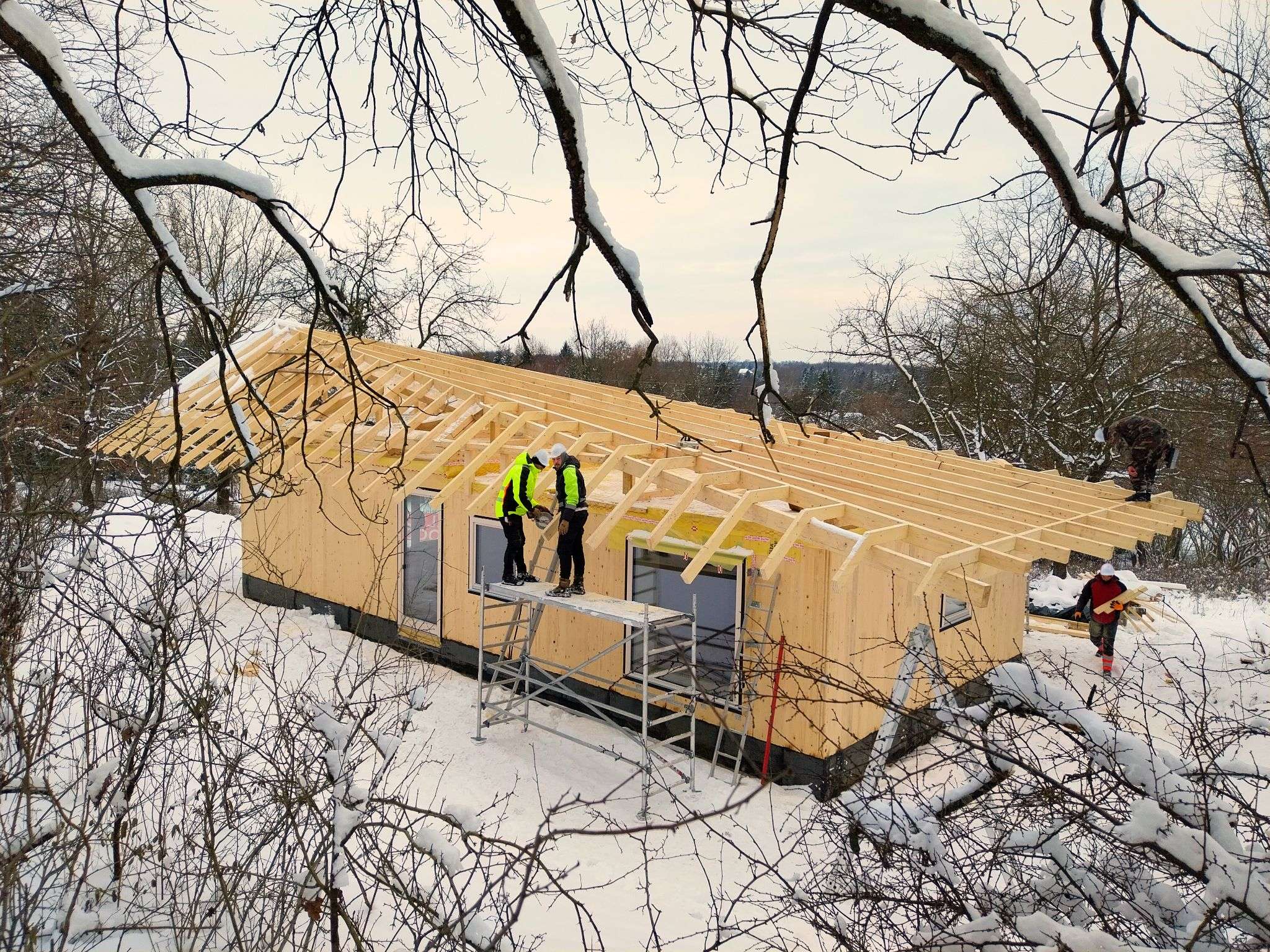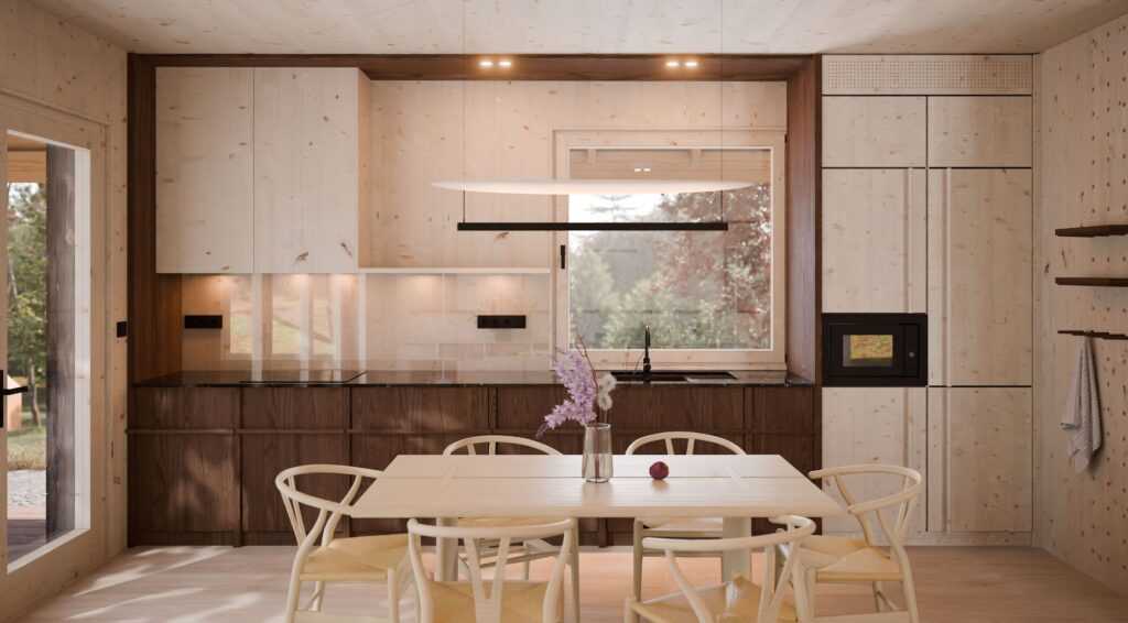 This house, entirely made from CLT (Cross-Laminated Timber), blends modern design with sustainability. From the initial idea to the final, turnkey result, our dedicated team manages the entire process, ensuring every detail is executed flawlessly. The house spans 77 m², with an additional 29 m² covered terrace, providing a perfect balance between indoor comfort and outdoor tranquility. Designed as a full family home, this space is intended for two people who wish to retreat from the noise of city life in their later years. It offers a calm and peaceful environment, allowing them to enjoy their golden years in harmony with nature.