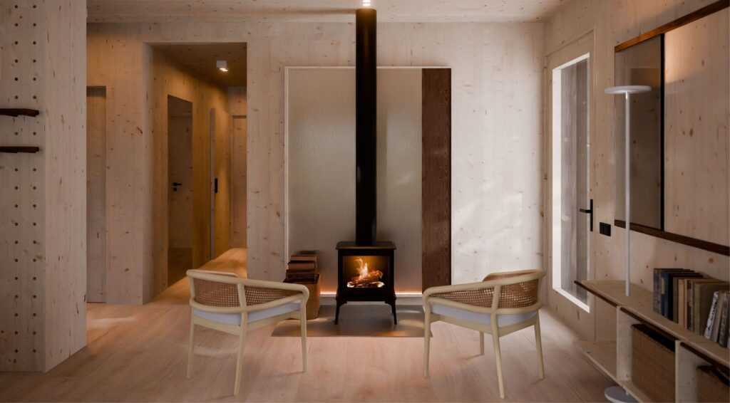The design of the entire house, from the fireplace to the carefully selected materials, reflects a strong emphasis on creating a cozy environment. Every detail has been thoughtfully considered to promote a sense of calm, allowing the residents to embrace a slower pace of life, away from the demands of the outside world.