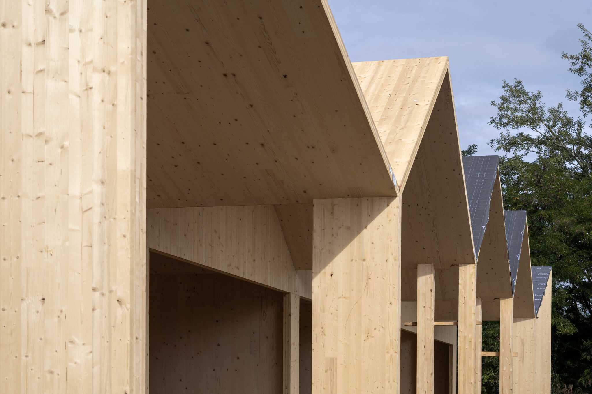 The school is constructed using three primary materials: wood, polycarbonate, and steel. CLT elements are manufactured in prefabricated, precision-cut forms, resulting in minimal construction waste. When dismantled, many parts can even be composted. Polycarbonate is recyclable and adaptable, while steel is used selectively where structural demands exceed wood’s capacity. The building rests on ground screws rather than a traditional concrete foundation, significantly reducing the need for concrete and lowering the project’s overall ecological footprint.