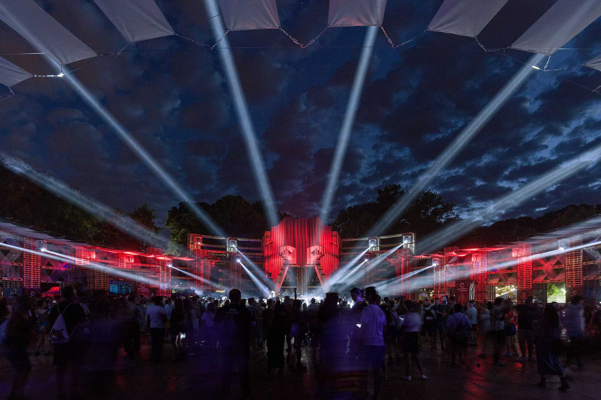 With a focus on sustainability, most of the Colosseum’s construction materials were recycled, recyclable, or reusable. Hello Wood, which was also the contractor, rented the 4,400 pallets required for the construction of the building. This way the manufacturer was able to sell them in their original function after the structure was dismantled. The construction of the structure was a logistical feat, as only three weeks were available for building and a week and a half for disassembly.