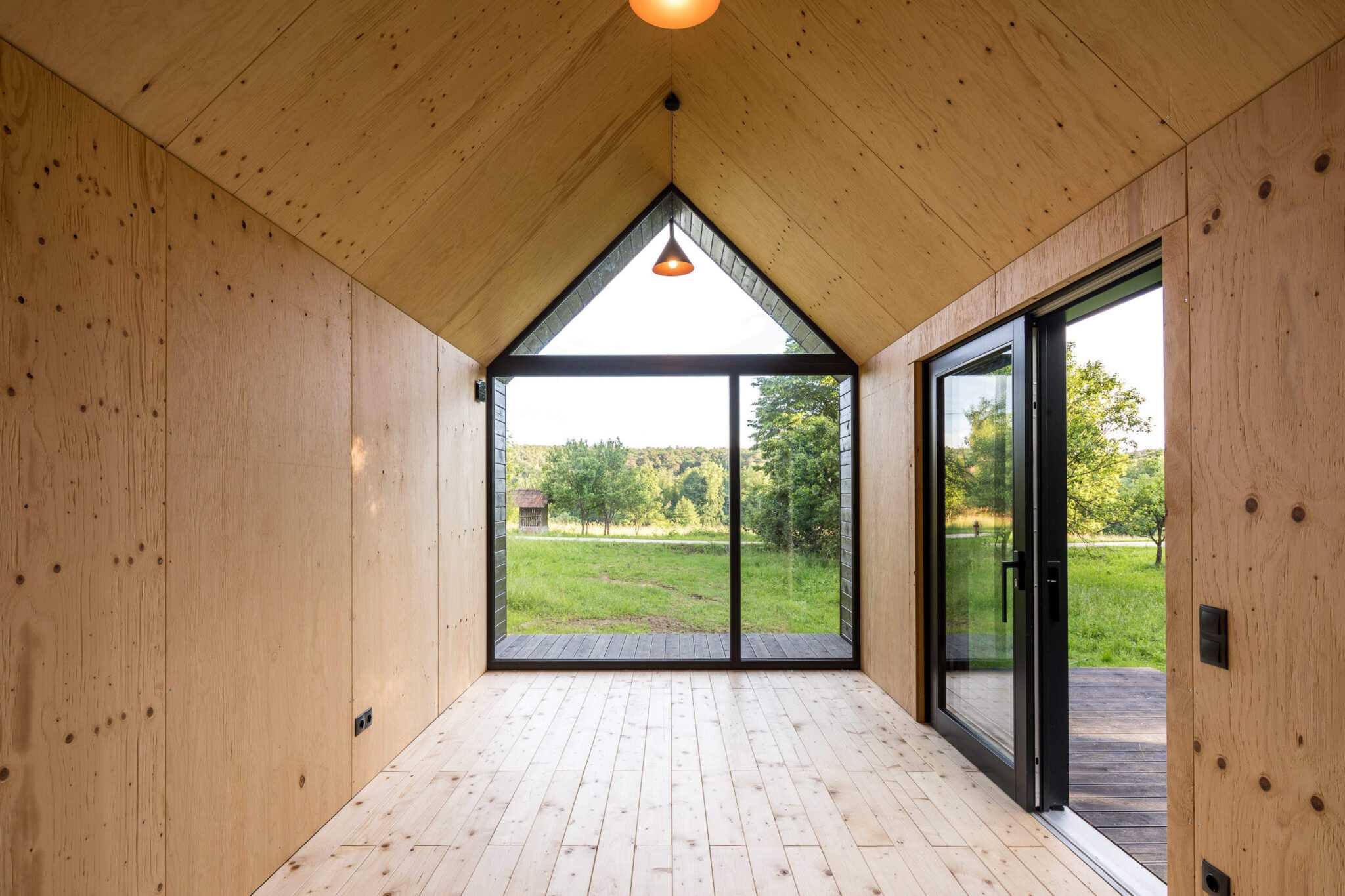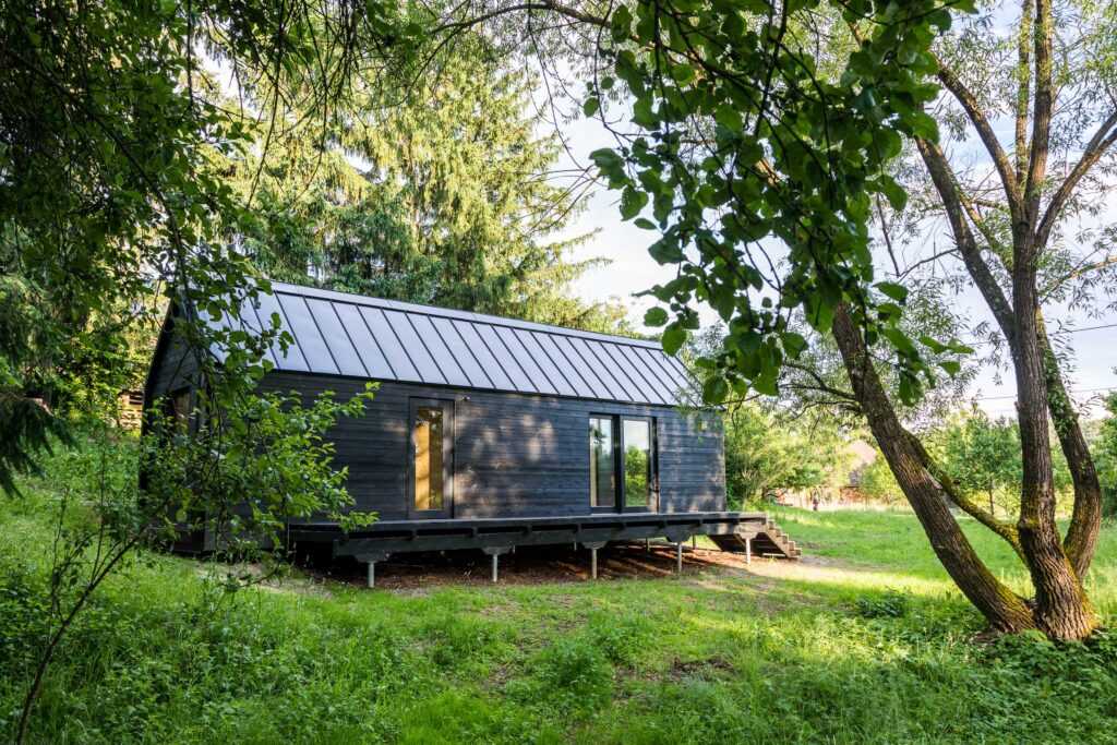 Like the traditional farmhouses of the region, the Kabinka Spa has a longitudinal orientation. On its long side, a glazed entrance and a spacious terrace with a view of the garden and its buildings were placed. To match the adjacent modern barn-style house, the end wall of the cabin is also made of glass so, from the sauna, one can enjoy a great view of the small valley next to the house. The bedroom on the other side of the building is shaded by the trees of the forest belonging to the land. The construction of the Bath House took only a week, as all the elements arrived at the site prefabricated and ready to assemble. Thanks to the shift building process, the cabin – built in May – was available to its owners the whole summer already.