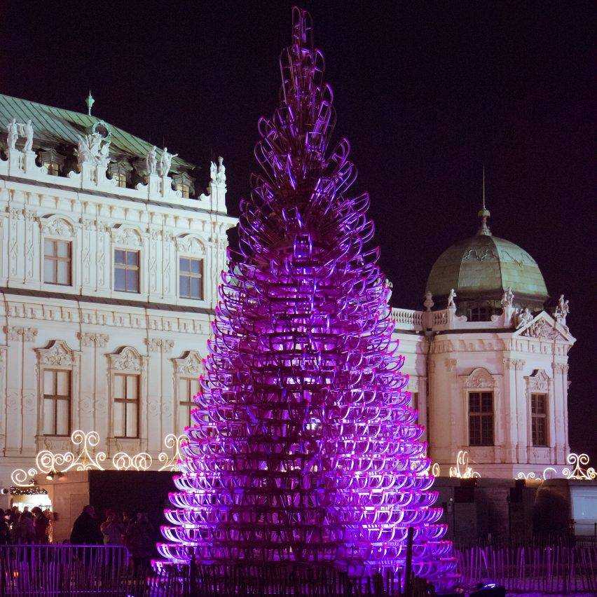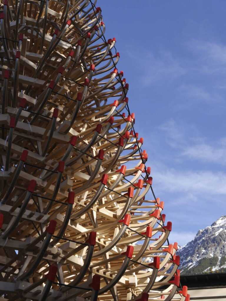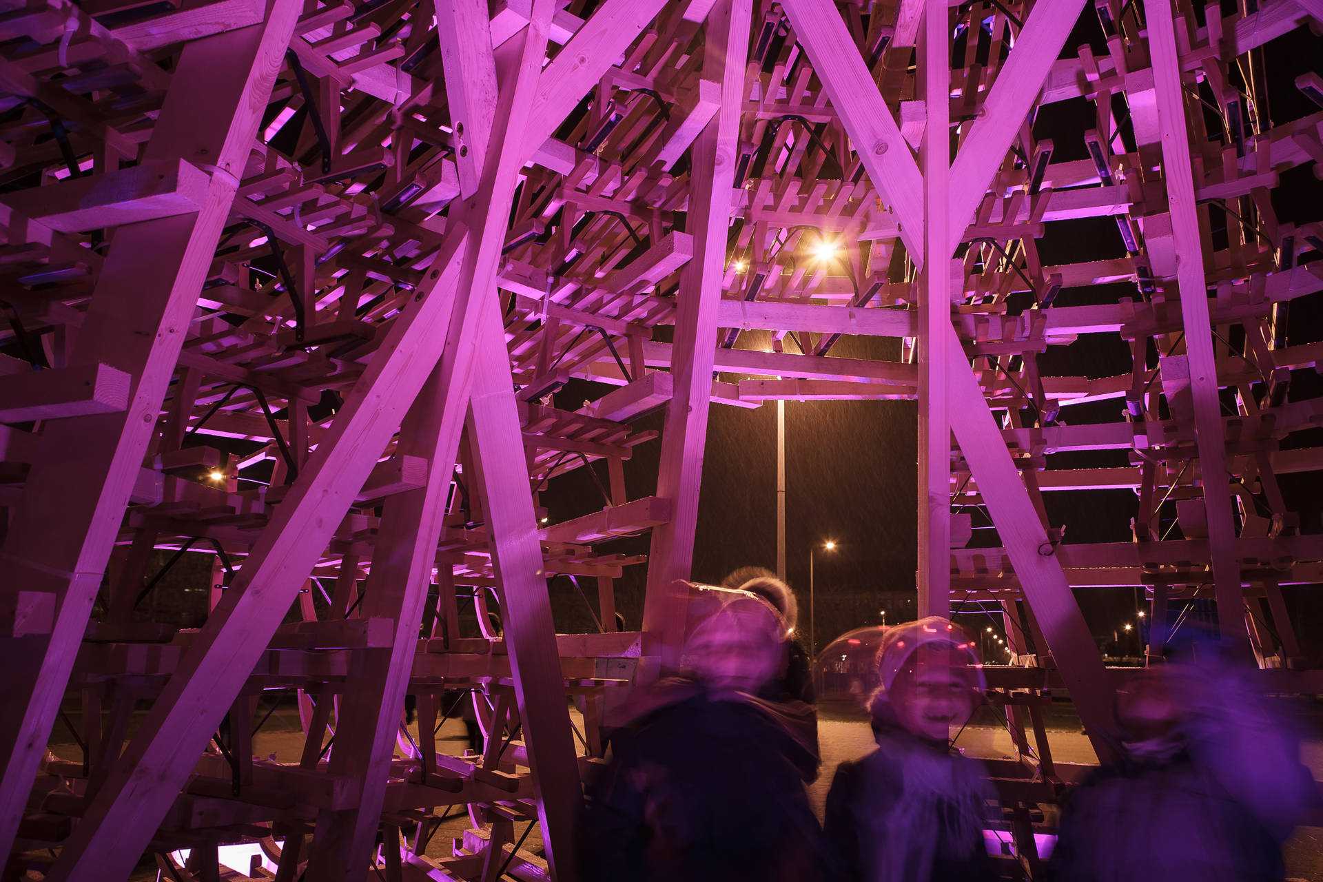 The 11-metre-tall structure was made up of 365 sledges and was on display outside Müpa Budapest during the holiday season. It proved popular among visitors, who could view the uniquely designed wooden framework from the inside, and at night, marvel at its colorfully illuminated surface. Beyond its aesthetic value, however, the installation also conveyed a message of hospitality and community: after it was dismantled, the sledges were donated to the SOS Children’s Villages in Hungary.