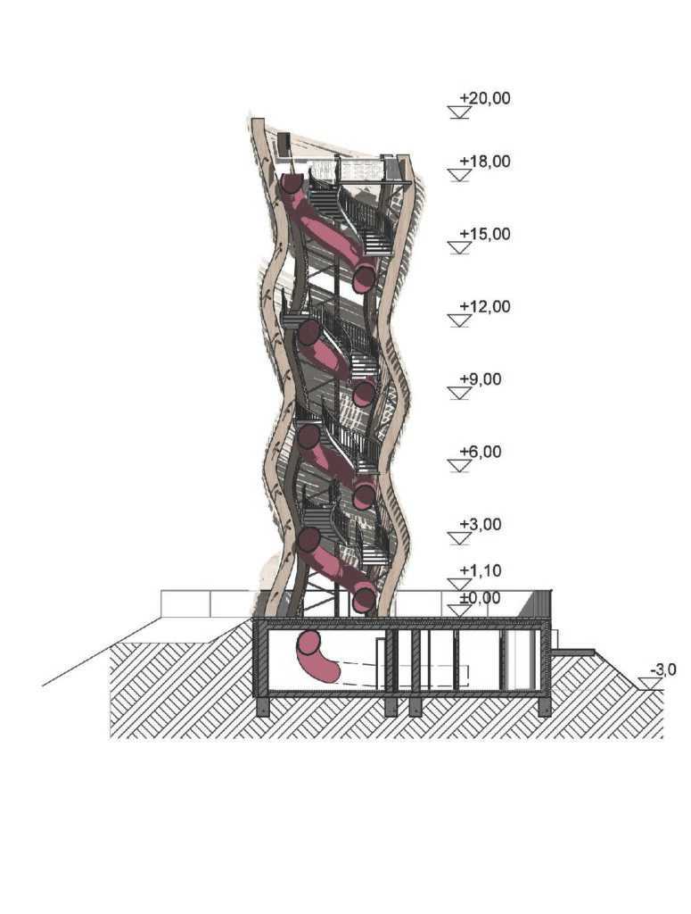 Spiral Tower is our first prize winner concept for the lookout tower Bence-hegy inspired by the commonly known fairy tale Jack and the Beanstalk. The tower is designed as a significant and lovable artwork of its environment using suitable natural elements.